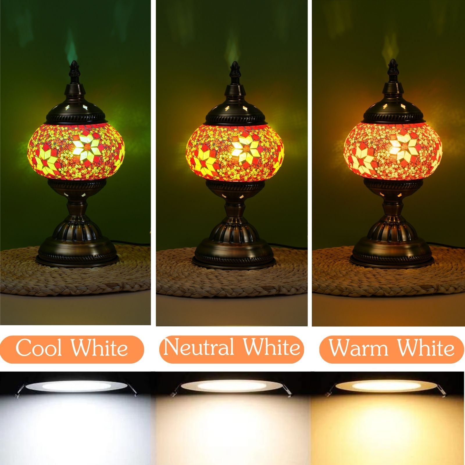 Handmade Moroccan Turkish Mosaic Table Lamp with - Glass Shade & Vintage Bronze Base - 3-Color Adjustable (/Green/Yellow) Arabic Lantern Light for Bedside, Living Room, Cafe - Bulb Included, Easy Assembly