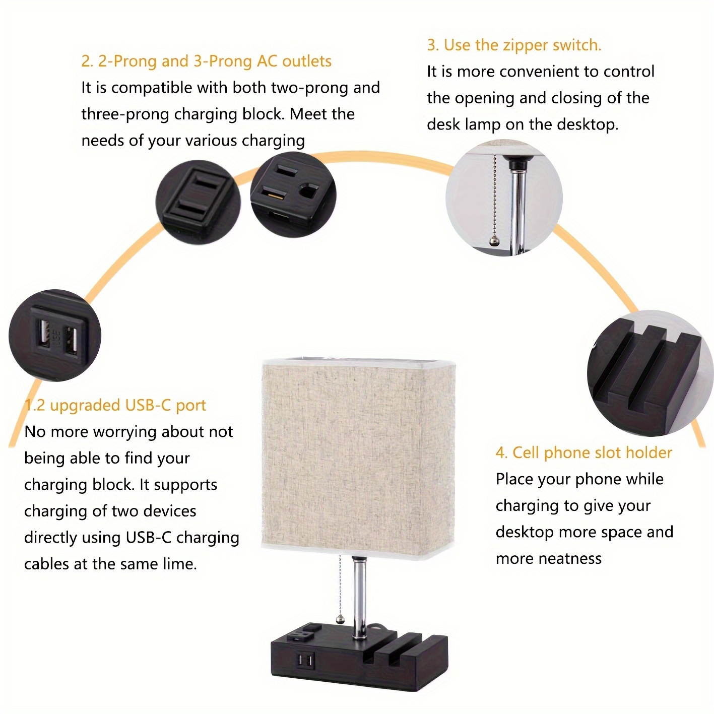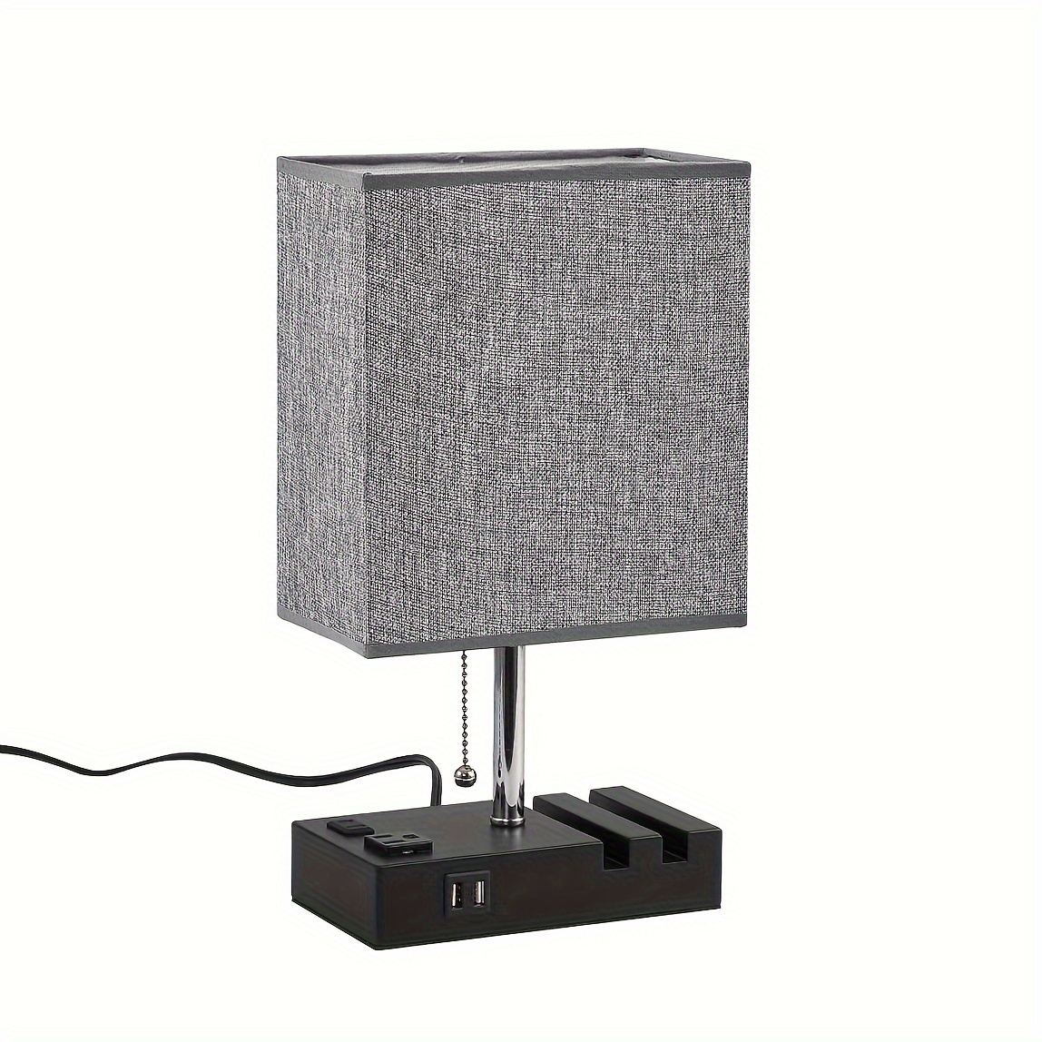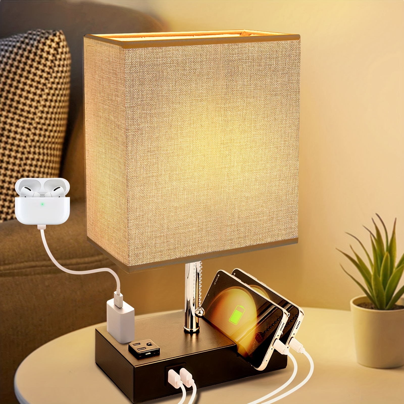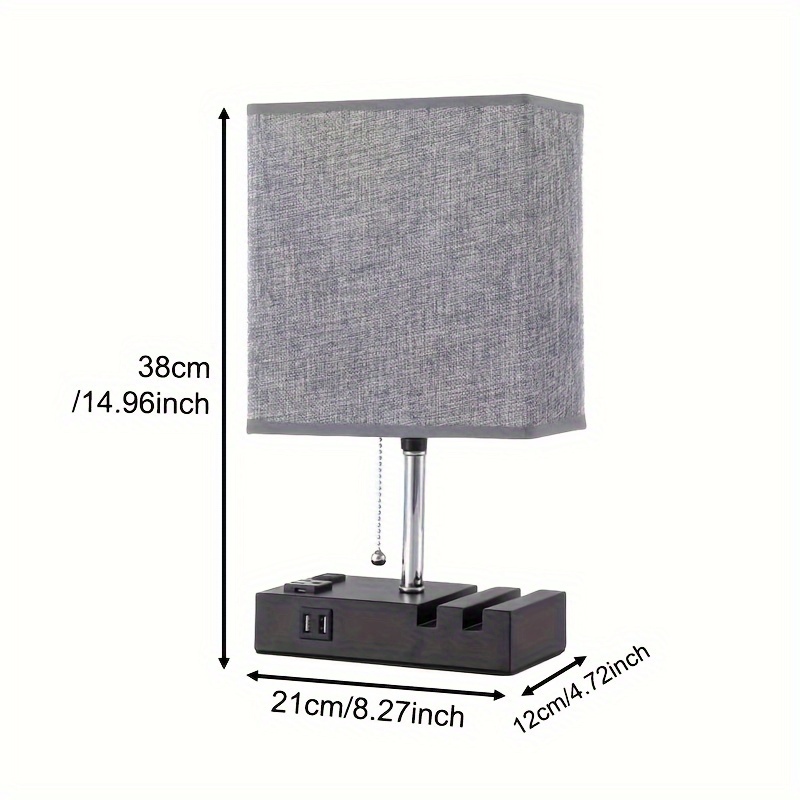 Modern 3-Color Temperature Table Lamp with Dual USB Ports & AC Outlet, Fabric Shade, Built-in Phone Stand, and LED Bulb – Perfect for Bedroom, Living Room, or Office