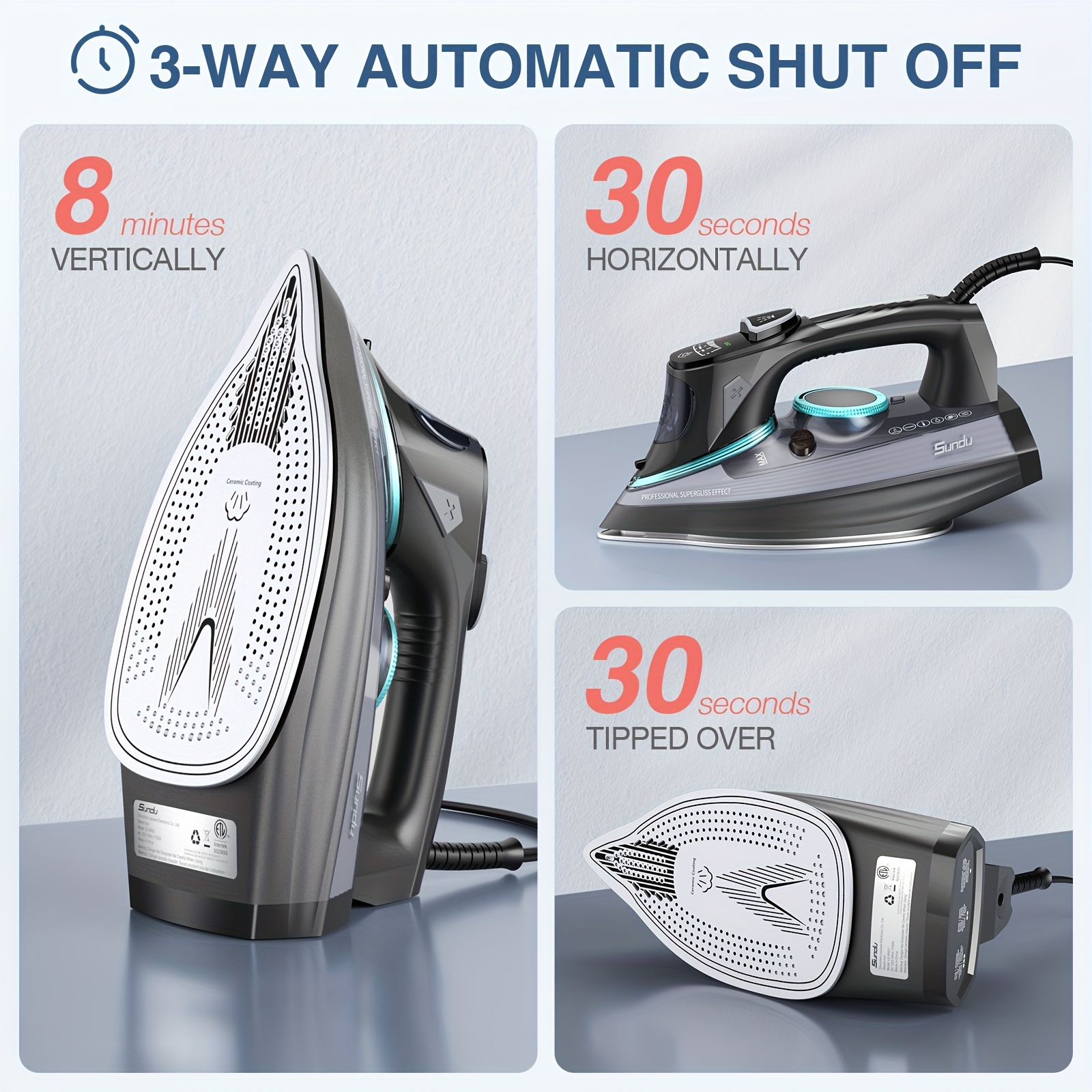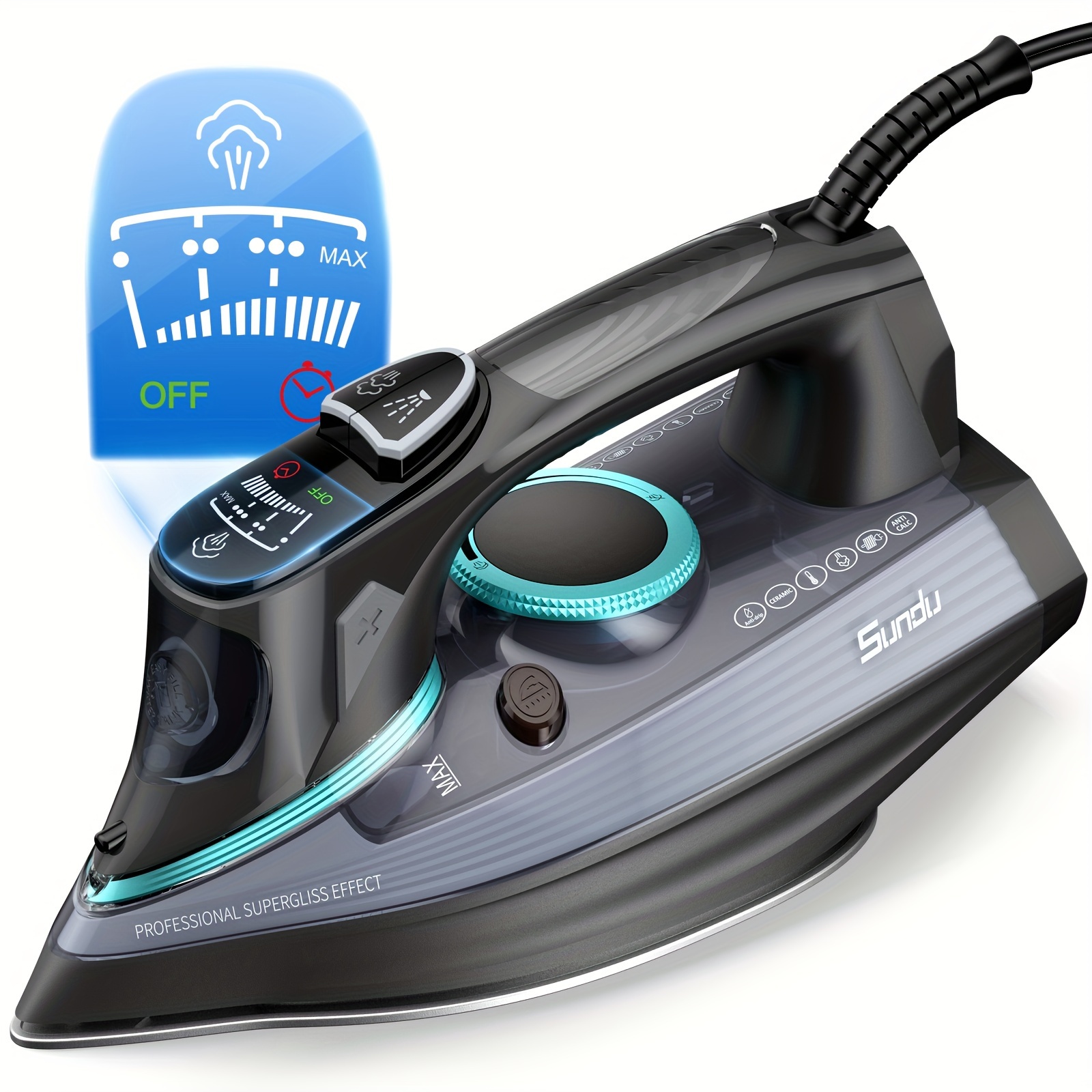 1700-Watt Steam Iron with Digital LED Screen, Ceramic Coated Soleplate, Anti-Drip & Self-Cleaning, 3-Way Auto Shut-Off, 4 Preset Steam & Temperature Settings for Various Fabrics, 300ml Water Tank, Portable Design